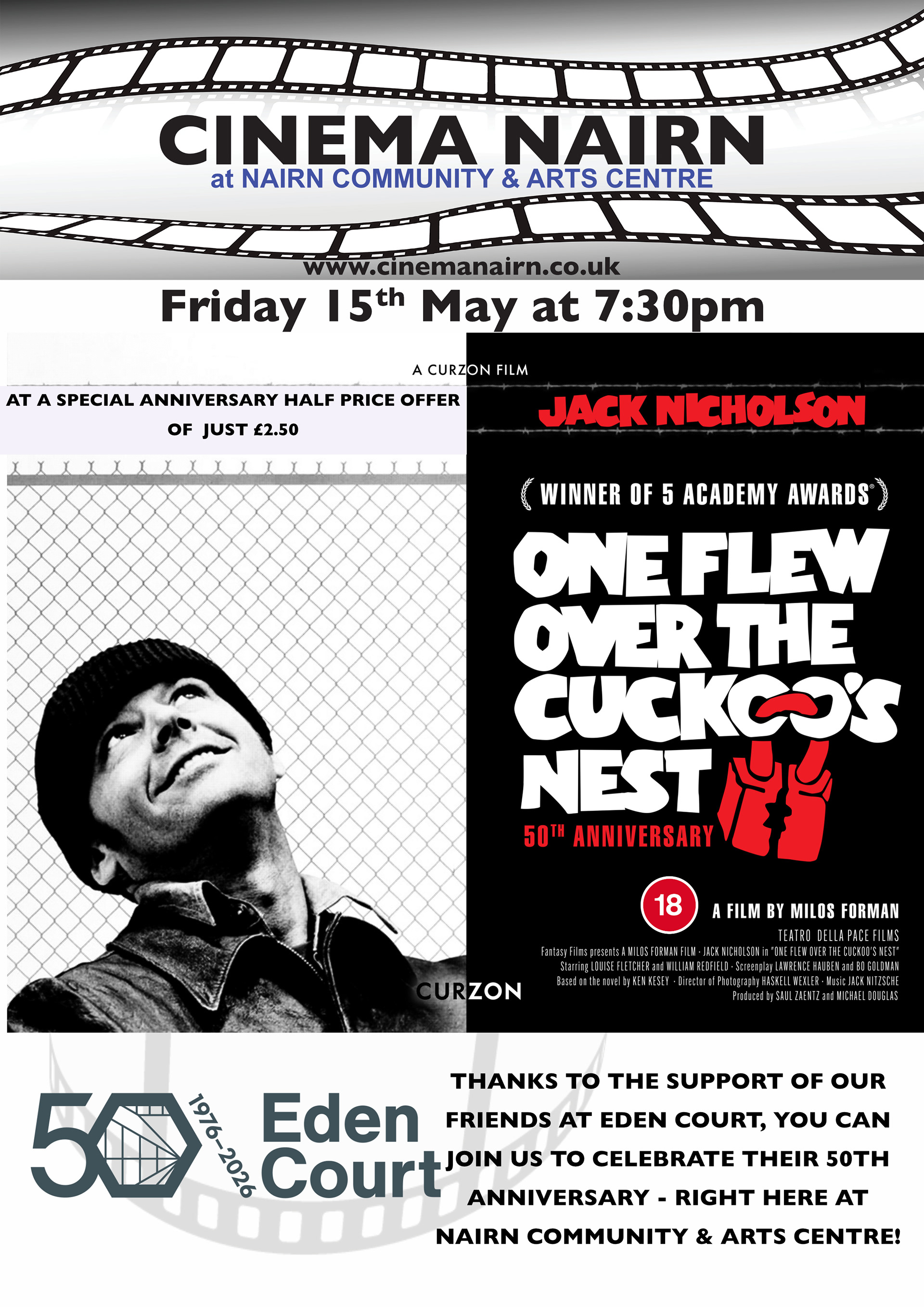 We are delighted to announce that we have ben invited to join in the 50th Anniversary celebrations of the wonderful Eden Court by screening One Flew Over the Cuckoo's Nest, which was released in the UK in the same year that Eden Court opened in Inverness.